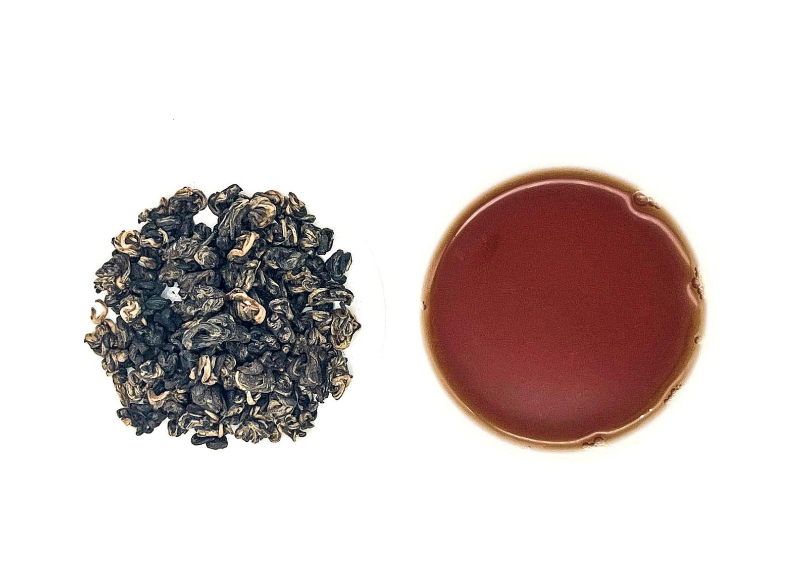 Die großen Blätter mit goldenen Spitzen werden in der Wiege des Teeanbaus, im chinesischen Yunnan geerntet und von Hand zu großen Perlen geformt.